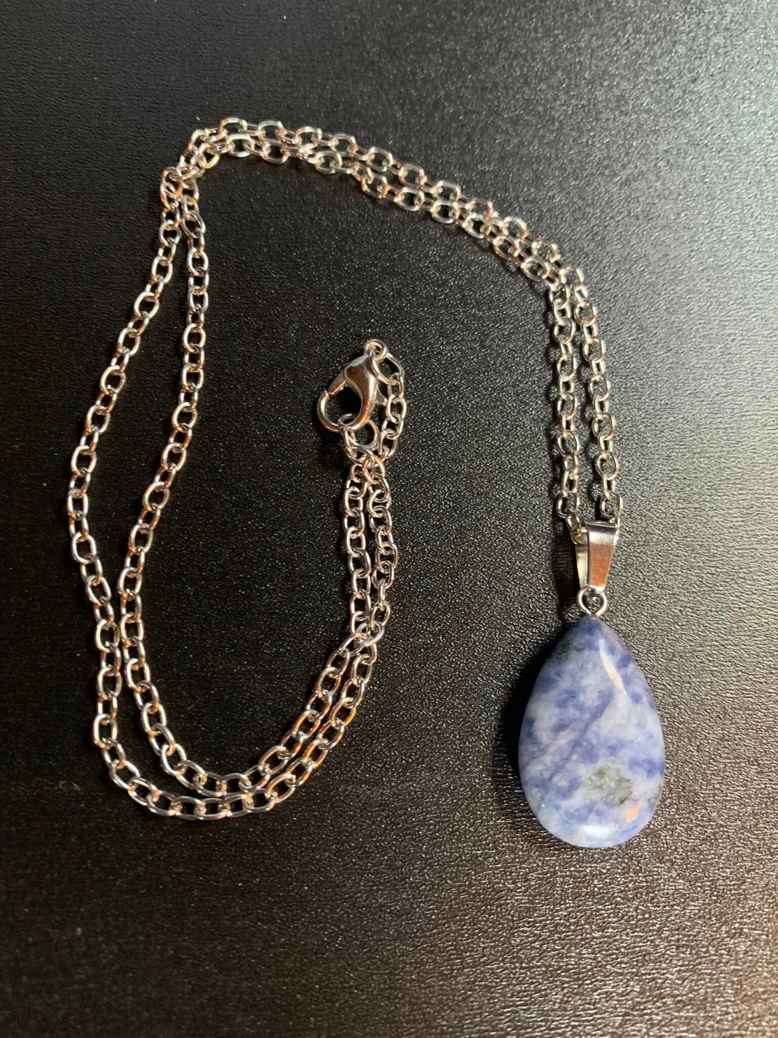 Gemstone Tear Drop Necklace on an 18 inch stainless steel chain. Options: Blue Sodalite, Clear Quartz, White howlite, Green Aventurine, Unakite, Yellow Jade, Picture Jasper, Tigers Eye, Dalmation Jasper